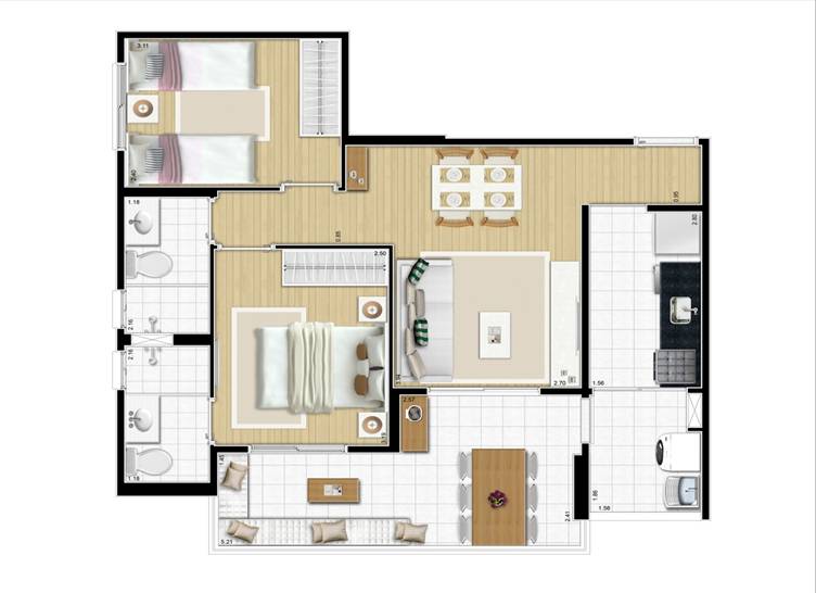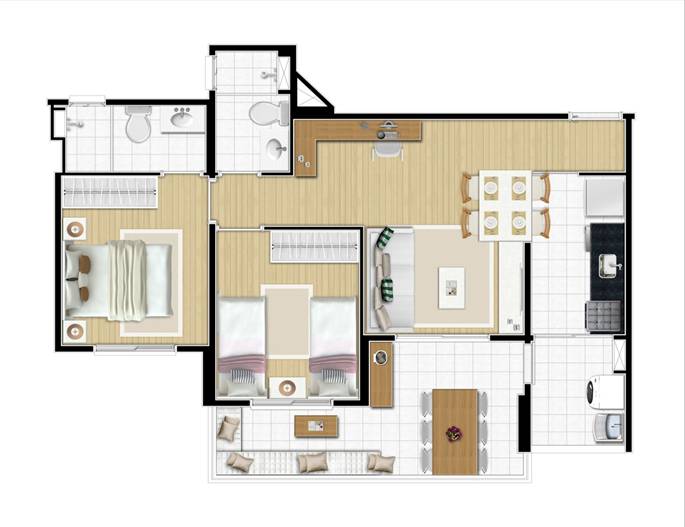PLANTA BAIXA (63m²) - 2 DORMITÓRIOS (1 Suíte) (Apto Ponta)